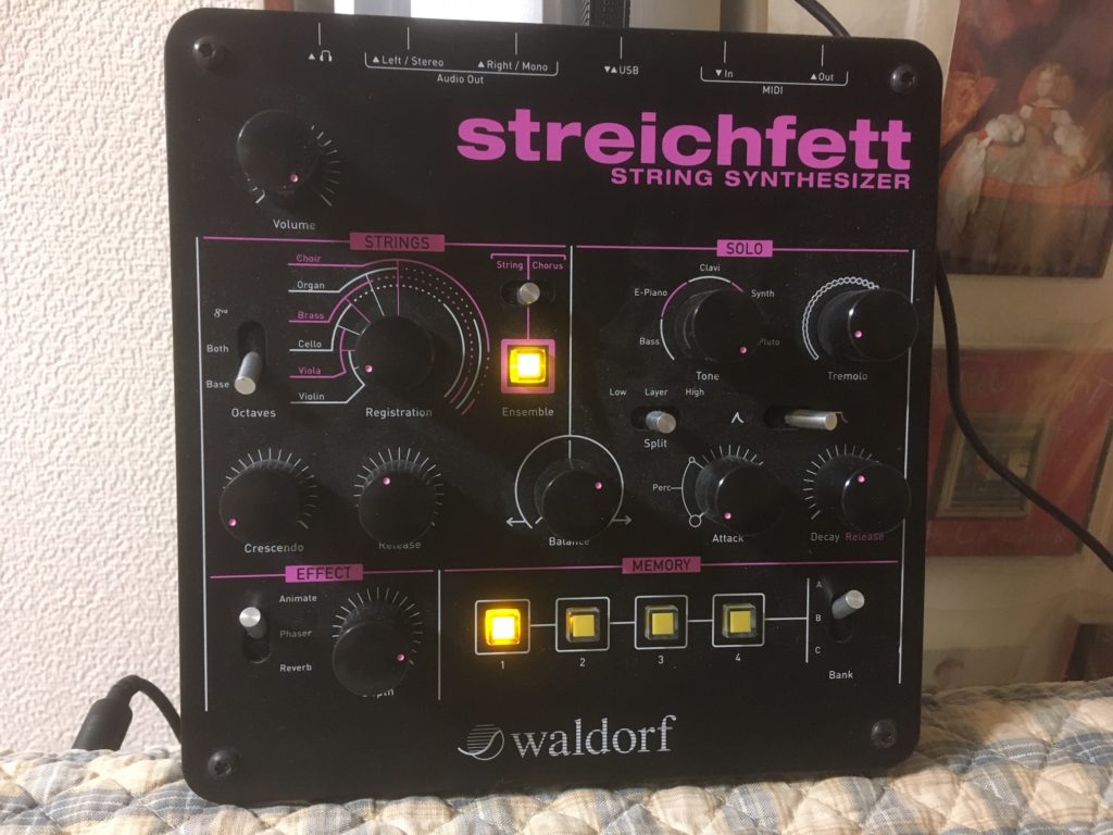 “streichfett”が素晴らしいのは、そんな重厚かつ深遠な音が、超イージーオペレーションで作れてしまう点にあります。乱暴にサマりますが、本体左側で音のキャラクターをざっくり決めます。あとはオクターブ、アタックとサステインの塩梅、コーラス系のエフェクトを種類を決めます(オフにするってのは考えにくいです。すんげぇソソるので)。で、右側でもう1系統音を作れるので、そっちもチャチャッと作ってしまいます。あとは、左と右のバランスを中央のツマミで決めるだけです。最後に左下でさらにエフェクトを加えることができるので、それをやったらおしまい。こんだけです。